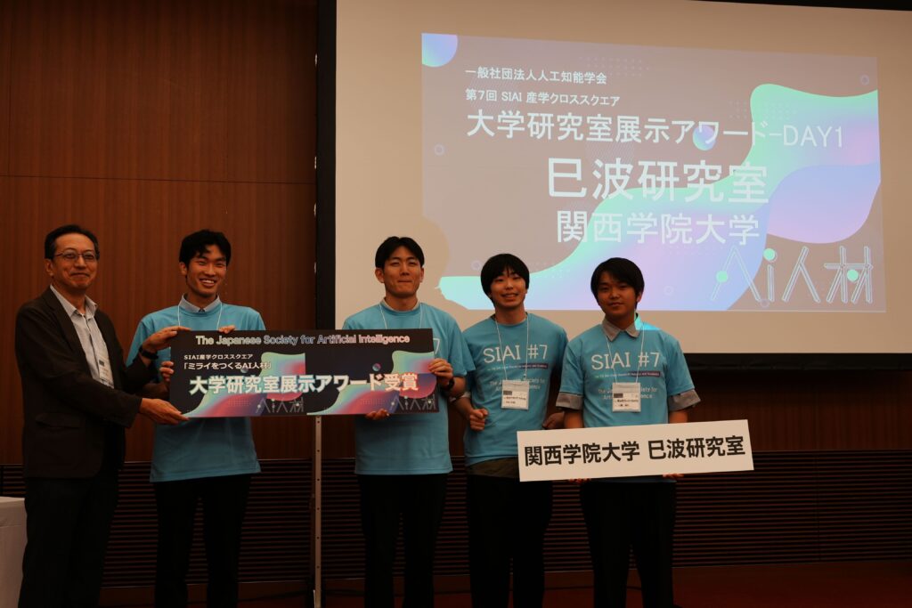 2025年9月12日から13日にかけて立命館大学 大阪いばらきキャンパスで開催された人工知能学会SIAI2025(産学クロススクエア「ミライをつくるAI人材」)において、巳波研究室の杉本(M1)、川瀬(B4)、杤尾(B4)、橘(B4)がSIAIアワードを受賞しました。