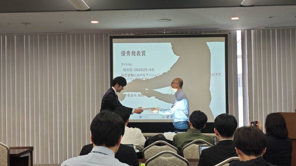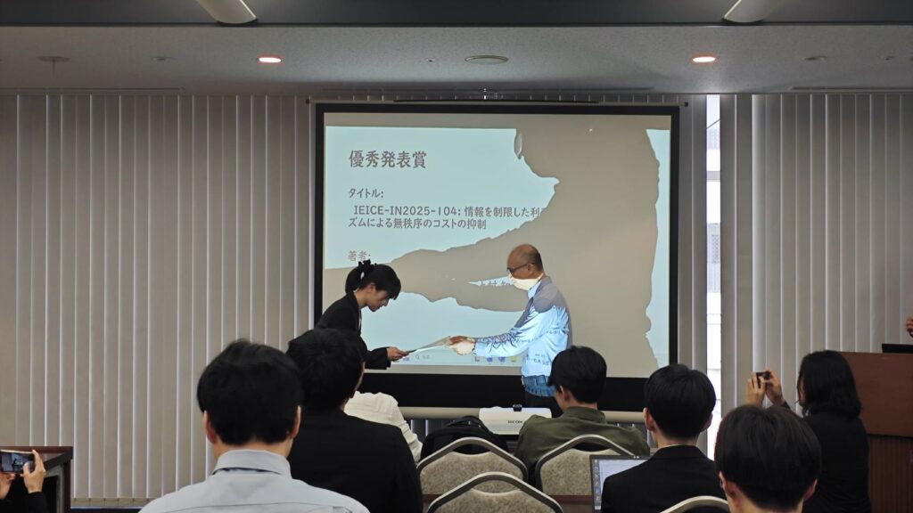 情報ネットワーク研究会最優秀発表賞・優秀発表賞は、情報ネットワーク研究会において発表があった一般講演の中から特に優秀であり、今後の活躍が期待される発表者/共著者に対して贈られる賞で、2026年3月4日に行った講演"航空管制におけるプッシュバックを考慮した地上走行誘導経路およびスケジューリング決定アルゴリズム"、2026年3月6日に行った講演"情報を制限した利己的ルーティングアルゴリズムによる無秩序のコストの抑制"がそれぞれ高く評価され、発表者である巳波研究室の長谷川瑞和、川瀬麗奈、上村知が情報ネットワーク研究会優秀発表賞を受賞しました。