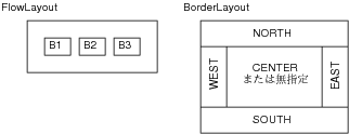 - BorderLayoutはフレームを上下左右および中央に分け,add(部品,場所)により,部品を配置する場所を指定できる.