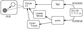 以下のサンプルでは,Circleのインスタンスc1を,LinearMoveとColorTransのインスタンスの引数に代入することで,c1に移動と変色の機能を加えている.