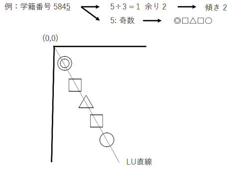 なお,学籍番号から求める上記余りの値は,作成するプログラム中で求めるのではなく,手計算で求めて直線の傾きや,表示する図形の種類・表示順をあらかじめ決めておくこと.